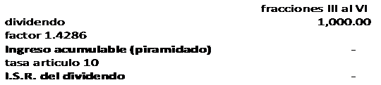 Es claro el criterio de la autoridad que de las fracciones III a la VI ni siquiera se debe hacer el calculo de dividendos. De haberlo hecho se hubiera incurrido en una doble tributación, esto es que las fracciones III a la Vi del articulo 165 de la Ley del impuesto Sobre La Renta incurren directamente en la utilidad fiscal y no como dividendo de dicha persona moral. Con este criterio se da la equidad a la persona moral de no caer en un supuesto de doble tributación, sin embargo dejaremos el tratamiento de la Cufin y la repercusión en la persona física para otra ocasión. No nos pierda de vista por favor.